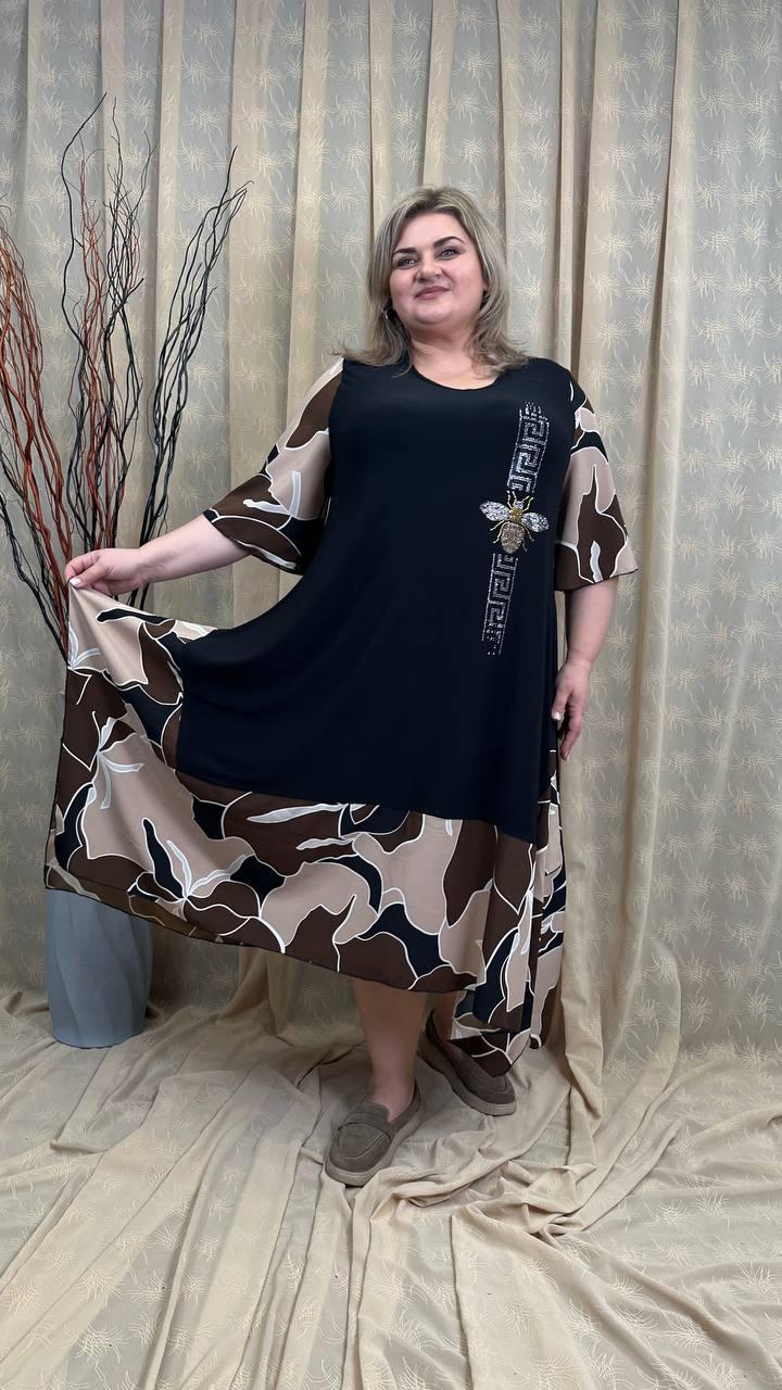 Клешена вільна сукня з трикотажу олія з гарною розтяжністю, комбінована з легкою тканиною супер-софт.